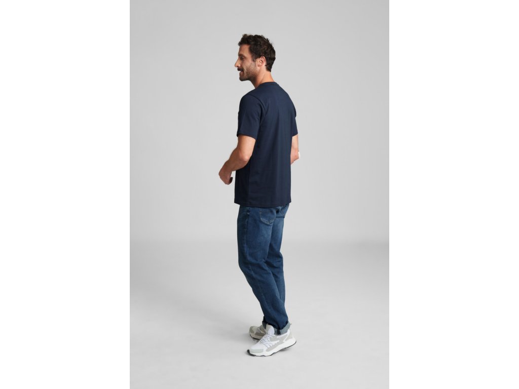 Jednoduchá tmavě-modrá barva a kulatý výstřih se snadno kombinují s džínami i pracovním oblečením. Vzniká tak univerzální kousek, který funguje v dílně, ve městě i na víkend.